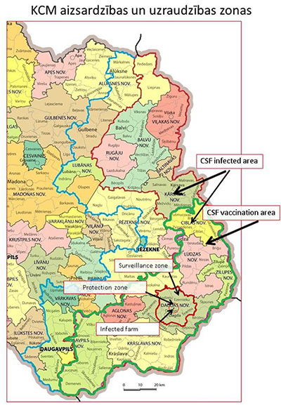 In Letland is 15 km van de grens met Wit Rusland opnieuw Klassieke varkenspest (KVP) geconstateerd bij gehouden varkens. Deze nieuwe uitbraak bevindt zich binnen de grenzen van het door de Europese commissie ingestelde besmet KVP gebied. De vorige uitbraak bij tamme varkens was in november 2012.