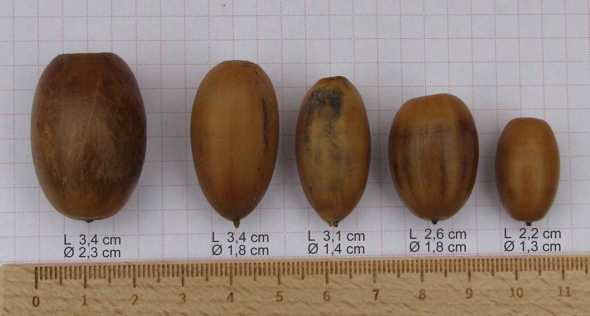 ![]() ![]() Links de eikel waardoor het kalf is gestikt. De overige vier eikels geven een beeld van de variatie in grootte binnen ‘normale’ inlandse eikels. |
