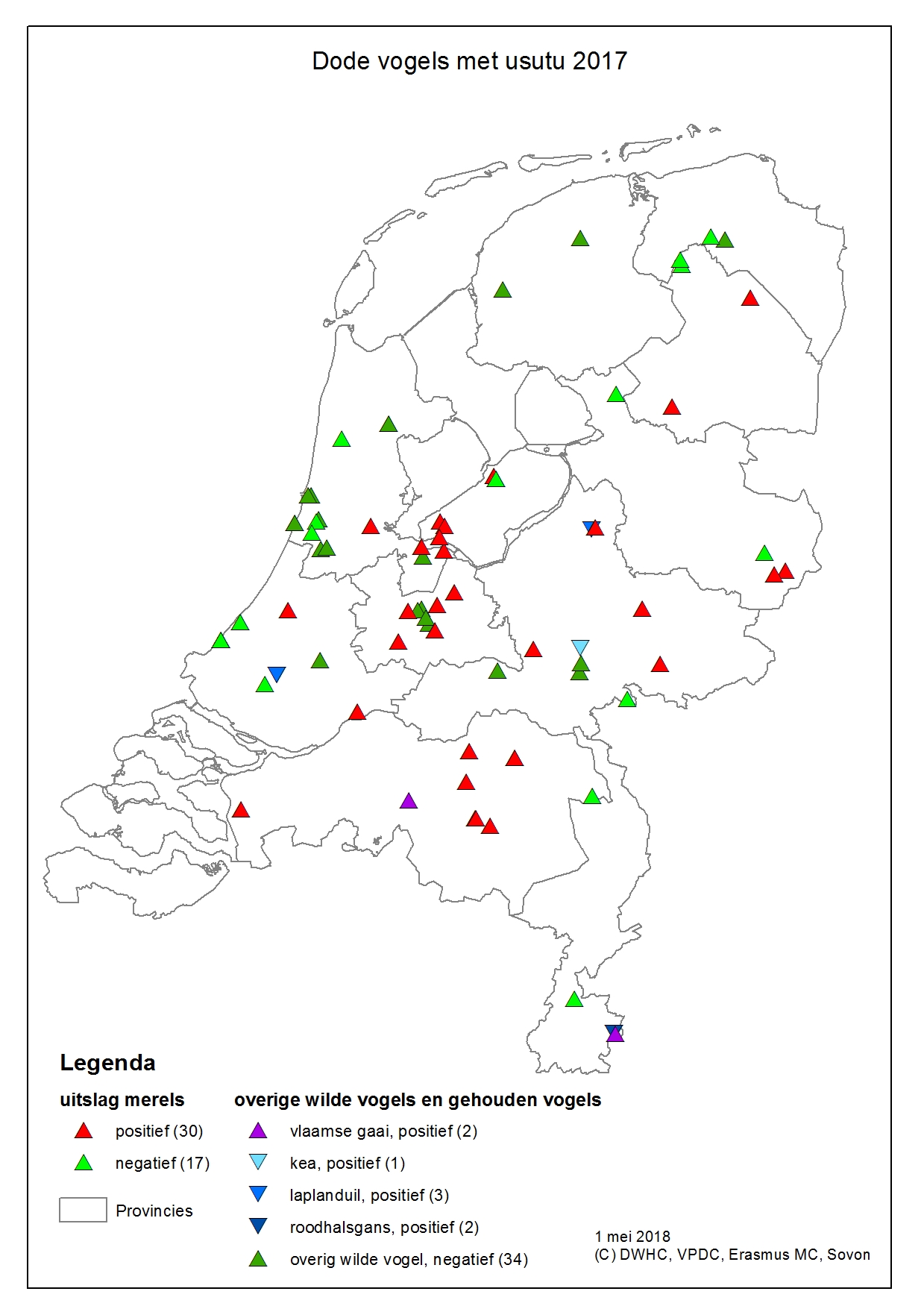 Op de rechterkaart staan de gemelde en onderzochte dode merels tot 1 november2017 weergegeven.
