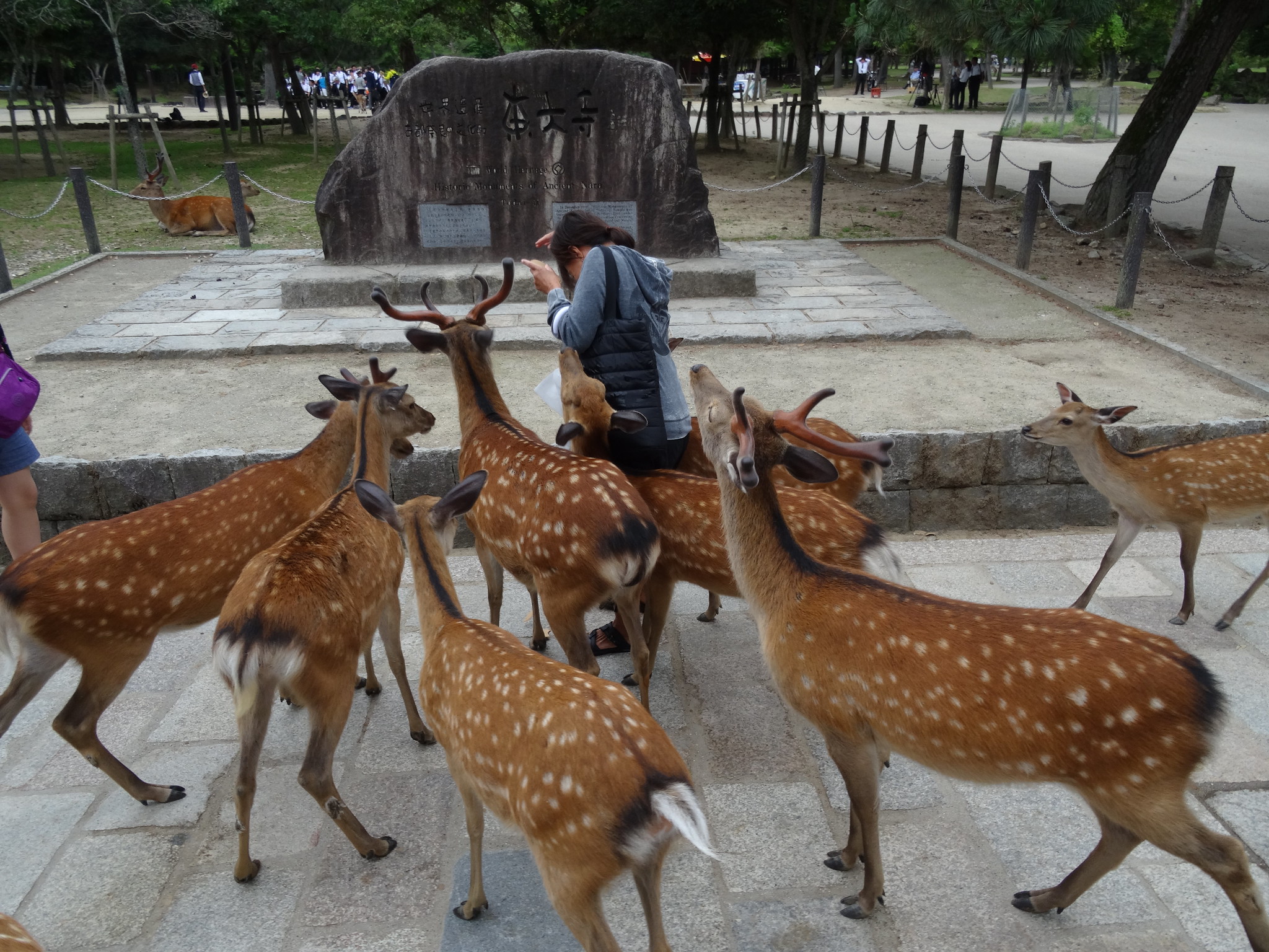 De Sikaherten lopen vrij rond en vormen één van de toeristische attracties van Nara. De Foundation for the Protection of Deer in Nara2 laat speciale crackers maken die toeristen kunnen kopen voor het voeren van de dieren. In vakantieperiodes zijn de dieren (soms) zo doorvoed zijn, dat ze nog nauwelijks op hun benen kunnen blijven staan3. Maar dieren eten ook (rondslingerend) plastic, hetgeen problemen veroorzaakt.