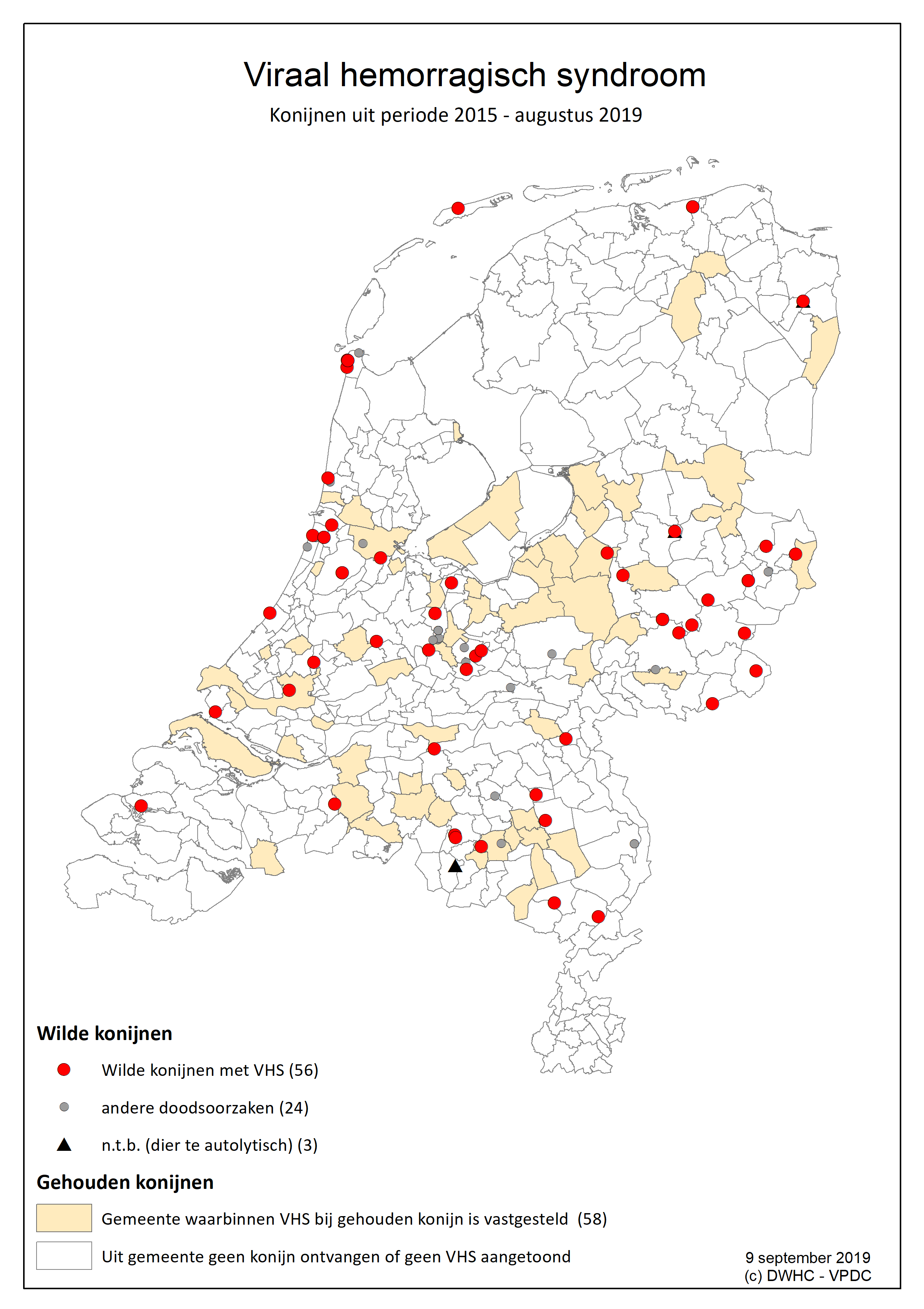 Op onderstaande kaart staat weergeven waar de wilde konijnen met VHS zijn gevonden. Voor de gehouden konijnen met VHS, zijn de gemeenten gekleurd. Maar omdat slechts een zeer klein aantal dode konijnen daadwerkelijk is onderzocht, geeft de kaart geen compleet beeld van de verspreiding van de ziekte in Nederland. Ook uit de witte plekken van de kaart komen meldingen binnen van acute konijnensterfte die wijzen op RHDV-2. Vandaar dat gesteld kan worden dat het nieuwe virus in heel Nederland voorkomt.