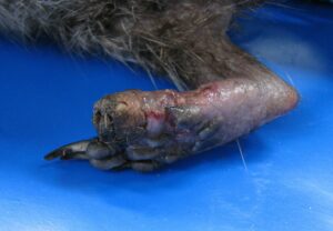 Bij zeven dieren werden ernstige huidafwijkingen aan de poten gevonden. Hierbij was opmerkelijk dat dit gevonden is bij de eerste zes onderzochte dieren (vanaf april tot begin augustus) en het dier van eind-december. Daarnaast had een jong dier dat in oktober binnenkwam, enkele oppervlakkige beschadigingen aan de achterpoot.