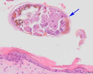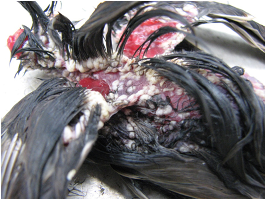 Dit jong had matige vetreserves en spiermassa en heeft te weinig voedsel binnen gekregen. Het dier was waarschijnlijk verzwakt geraakt door bloedzuigende mijten (Bakericheyla chanayi) op de borst. De witte plekjes op de borst waren namelijk de nesten van bloedzuigende mijten. Bij het microscopisch onderzoek waren in de huid ontstekingen te zien met daarin restanten van mijten.
