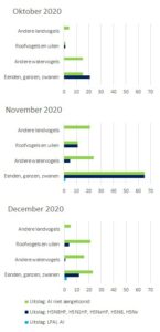 Dit is niet het volledige overzicht van de onderzochte vogels, omdat dit alleen de uitslagen zijn van wilde vogels die bij DWHC en Sovon zijn gemeld. Er zijn immers ook inzendingen geweest via andere routes, zoals via de NVWA. Ook zijn de onderzoeksuitslagen van vier vogels nog niet bekend. Wel toont het aan dat in oktober en november van vorig jaar ongeveer de helft van de eenden, ganzen, zwanen en roofvogels en uilen die via DWHC en Sovon werden aangeboden, positief testten. Het laat ook zien dat in december het aantal wilde vogels dat positief testte aan het afnemen was, maar dat de ziekte nog wel aanwezig was onder wilde vogels.