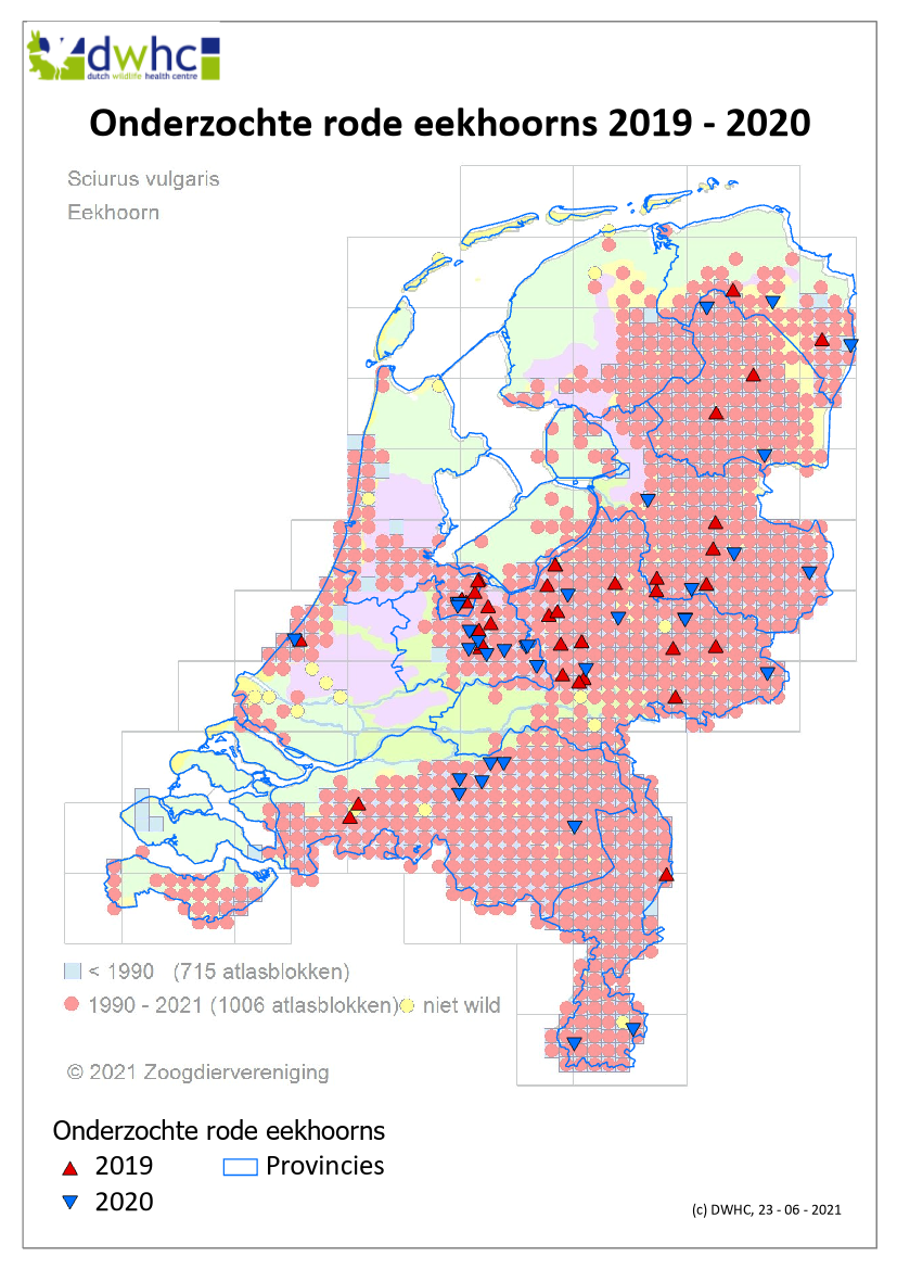 In 2019 werden 90 stervende en/of dode eekhoorns gemeld via het DWHC-meldformulier. In 2020 waren dit er 28. Daarnaast kwam er nog een tiental telefonische meldingen binnen. Het aantal door het DWHC opgehaalde eekhoorns was in 2019 en 2020 respectievelijk 37 en 34. In beide jaren kon 1 opgehaald dier niet nader worden onderzocht omdat het te ver was vergaan. Op figuur 1 staan de locaties weergegeven van de onderzochte eekhoorns.