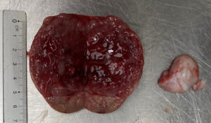 | Links de linker zaadbal met tumor, en rechts de normale rechter zaadbal. Foto: DWHC |