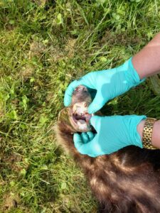| Het versleten gebit van de oude das. Bron: Karin Derikx, Stichting Dassenwerkgroep Brabant |
