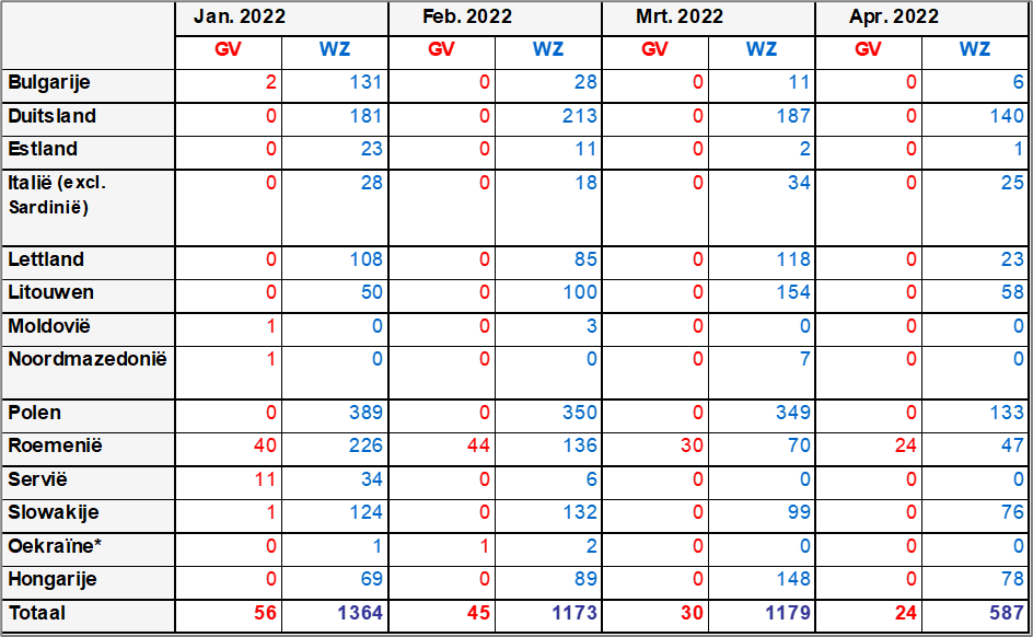 Zie onderstaande tabel voor informatie met betrekking tot de aantallen AVP bij gehouden varkens en wilde zwijnen in de periode januari – april 2022 in de overige Europese landen.