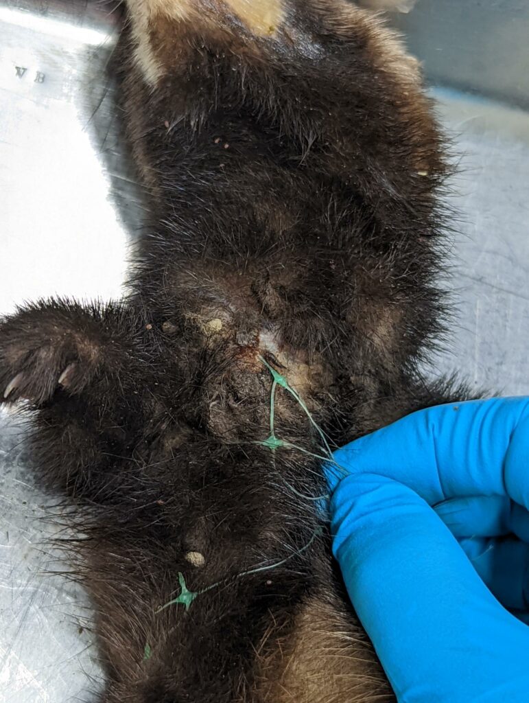 De bunzing was verwikkeld in een groen plastic net, zogeheten mollengaas, dat deels los om haar lichaam zat en deels, op de rug en tussen de voorpoten, door de huid heen was vastgegroeid. Op de rug was het draad op 2 plekken in de onderhuid vergroeid en waren chronische wonden met necrose ontstaan. Tussen de voorpoten zat onderhuids 2 cm draad dat was omringd met slijmerig wondvocht.