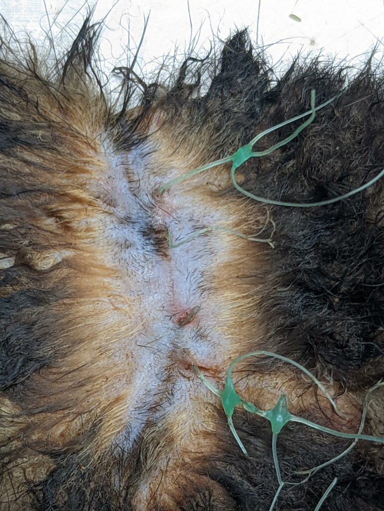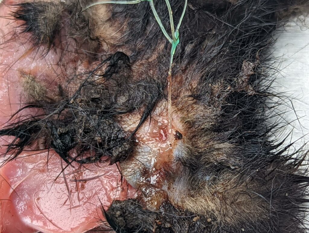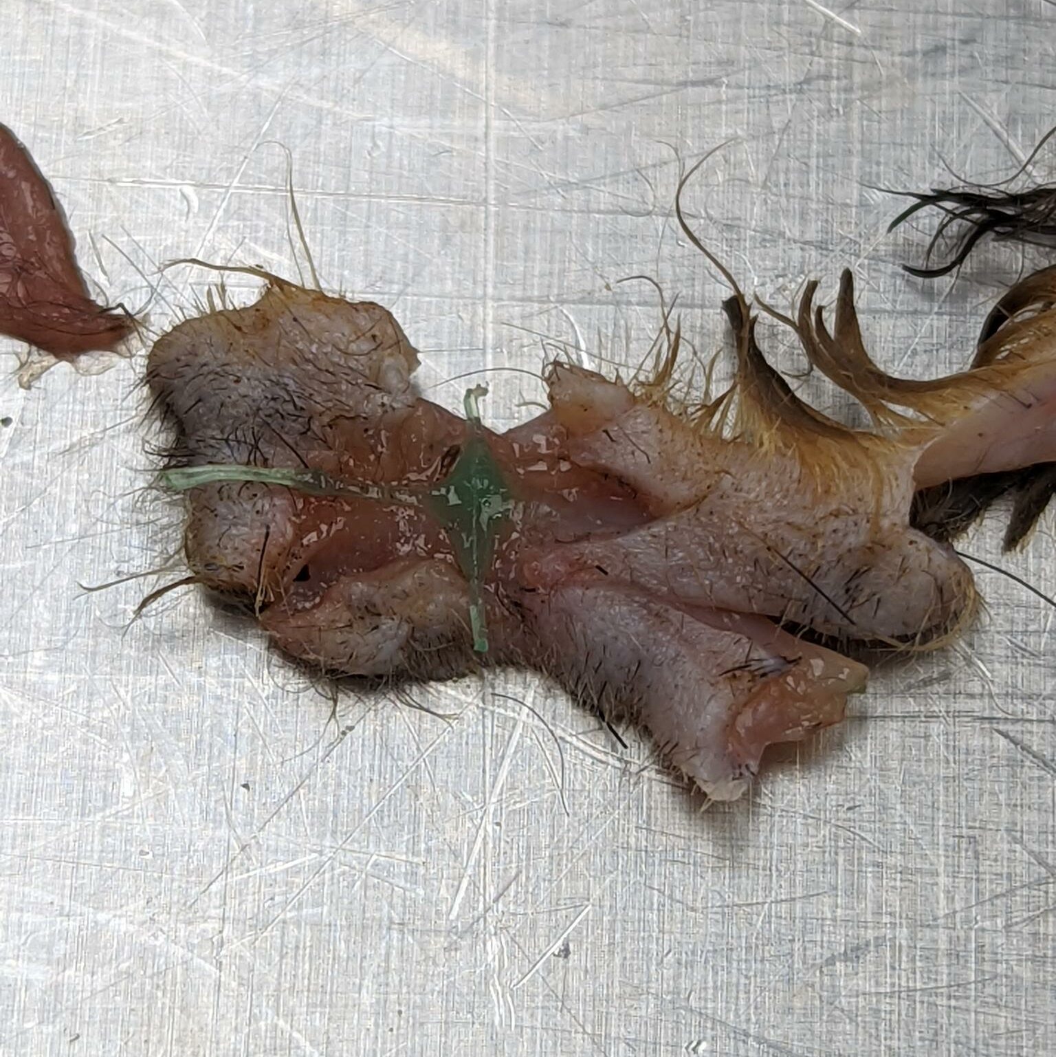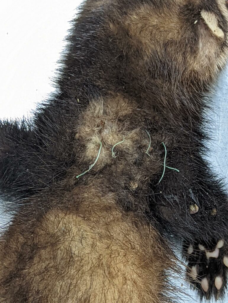![]() Foto 7 | Foto 1: De mollengaasdraden die op de rug “uit de huid steken”. Foto 2: Het gaas was tussen de poten door de huid heen gegroeid. Foto 3: De mollengaasdraden die op de rug “uit de huid steken”. Foto 4: Close up van de ingegroeide haren op de rug. Foto’s 5, 6 7: de mollengaasdraden in de onderhuid van de bunzing. Foto’s: Nadiah van Eijk, DWHC |