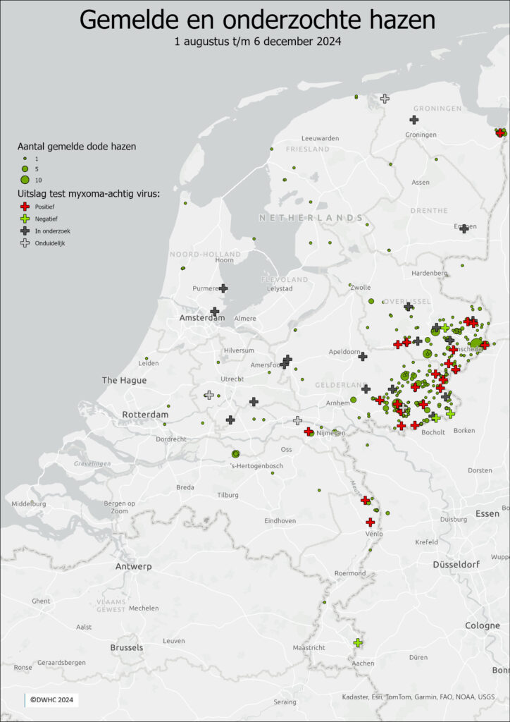 Een aantal van deze hazen is d.m.v. PCR getest op Treponema (”hazensyfilis”) en Myxomatose. Alle geteste hazen waren negatief voor “hazensyfilis” maar positief in de PCR voor Myxomatose. In samenwerking met collega’s in Duitsland wordt onderzocht of dit myxoma-achtig virus hetzelfde is als dat bij konijnen wordt gevonden, of dat dit een andere variant is. De ziekte is ook vastgesteld over de grens in Duitsland.