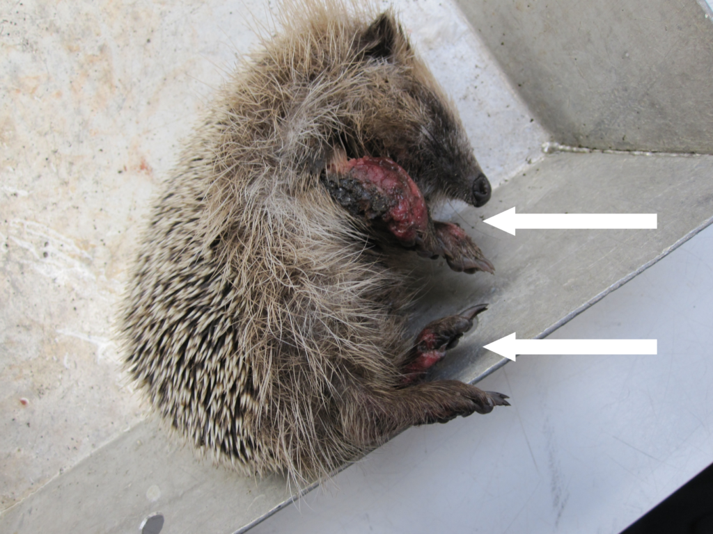 Wat erg opviel waren de poten van het dier: de huid was rood, verdikt, en had zweren (zie foto). Met behulp van bacteriologisch onderzoek is daar de aanwezigheid van Corynebacterium ulcerans (C. ulcerans) aangetoond. Deze bacterie scheidt een gifstof (exotoxine) uit wat weefsels beschadigt en behoort tot dezelfde familie als de C. diphtheriae bacterie. De plek van infectie, waar de toxines worden geproduceerd, heeft invloed op het type ziekteverschijnselen. Infectie rondom de luchtwegen kan moeite met ademhalen of eten met zich meebrengen, terwijl infectie van de huid zweren kan veroorzaken. Bij deze egel is de bacterie dus gevonden in de poten waar het geleid heeft tot zweren.