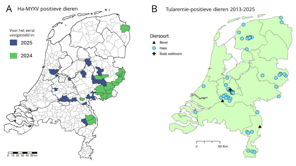 De aanwezigheid van myxomatose en tularemie is vorig jaar gevonden op verschillende plekken in Nederland (zie figuur 1a en 1b). We zijn speciaal geïnteresseerd in de gebieden waar de ziekte (nog) niet is vastgesteld.