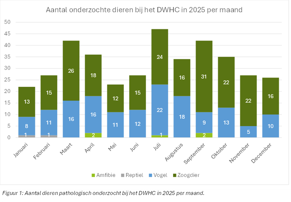 In 2025 zijn er 5385 meldingsformulieren ingevuld, waarvan 3348 voor inzicht in sterfte en 2037 voor het insturen voor onderzoek. Door middel van een triageproces zijn hiervan in totaal 1231 dieren opgehaald voor onderzoek, waarvan 388 dieren voor pathologisch onderzoek bij het DWHC. Dit waren 230 zoogdieren, 151 vogels, 2 reptielen en 5 amfibieën (zie figuur 1). Daarnaast zijn 843 kadavers van vogels opgehaald voor vogelgrieponderzoek bij het WBVR.