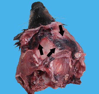 | Photo DWHC: Subcutaneous bleeding on the head (black arrows) |