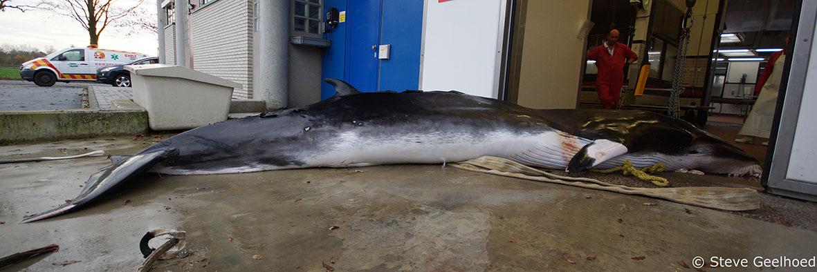 Post-mortem was performed on a common minke whale at the University of Utrecht after it was found dead on the bow of a ship in Rotterdam harbour. The cadaver was relatively fresh suggesting that it had only been picked up by the boat shortly before it arrived at Rotterdam. Provisional findings point towards the cause of death being collision with the boat.