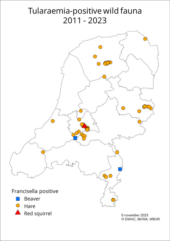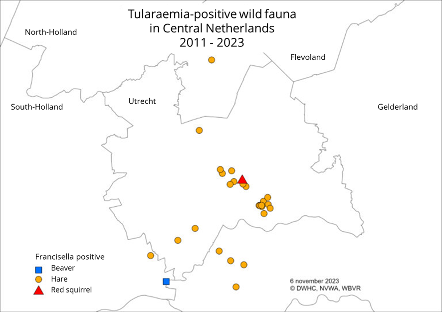 Tularemia has been frequently found in hares (Lepus europaeus) close to this red squirrel’s location (see map 1, wild animals with tularemia in the central Netherlands). In the Netherlands, tularemia has also been confirmed in two beavers (Castor fiber), in addition to hares. The first positive beaver was in North Limburg in 2020. This disease had never previously been detected in a red squirrel in the Netherlands.