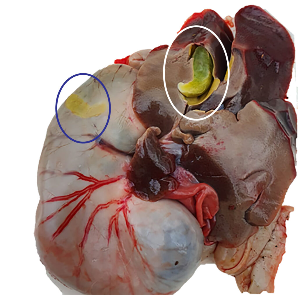 At DWHC, we regularly receive photos from hunters who discover unusual abnormalities during gutting. Often, these are organs with unusual spots and/or lumps. It’s almost never possible to determine the nature of the disease based solely on a photo. However, in certain cases, it’s not an “abnormality” but a normal organ (or part of an organ) that the hunter doesn’t recognize as such. This usually involves the gallbladder.