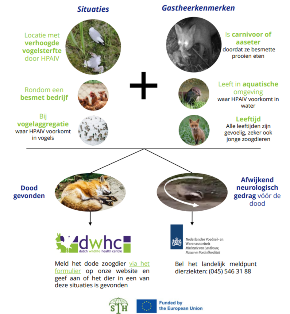Carnivores and scavengers can become infected with bird flu by eating infected wild birds. We would like to keep a close eye on this. In addition, monitoring allows us to see whether the virus adapts to a variant that, for example, can spread more easily among mammals or one that is more pathogenic. Therefore we ask for an increased vigilance regarding dead and sick carnivores and scavengers, regardless of their age, especially in areas where bird flu is prevalent, around poultry farms, and in places where many birds congregate (PDF for overview). The areas in which bird flu is found in wild birds are indicated on the NVWA distribution map.