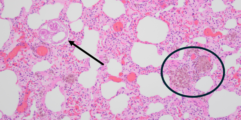 The badger died from peritonitis (inflammation of the abdominal lining) caused by the bacterium Streptococcus canis (S. canis). In addition, she had intestinal inflammation, mild heart problems, and fluid in the lungs (pulmonary oedema). Worms were also found in the lungs, which caused a mild pneumonia. Microscopic examination revealed a lungworm as well as inflammatory cells due to the inhalation of sand (see figure). Furthermore, this badger had skin inflammation on her abdomen caused by parasites such as fleas and possibly lice.