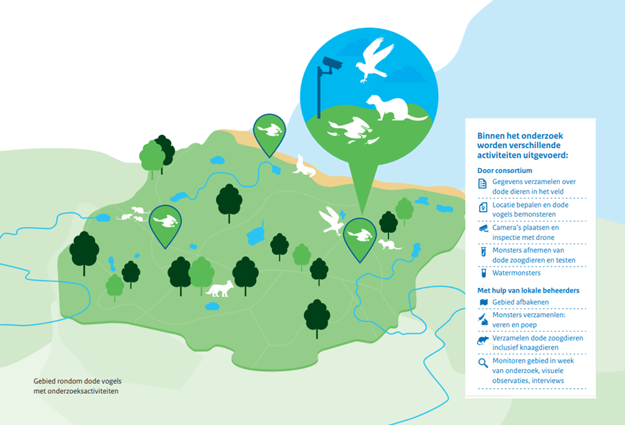 The Strong One Health project consists of different sub studies, for example the study on bird flu and scavengers (see figure). Mammals can get infected with bird fly by eating infected prey. This creates the possibility that the virus could adapt and become more contagious or pathogenic for humans and other mammals. Read more information on the website of the RIVM.