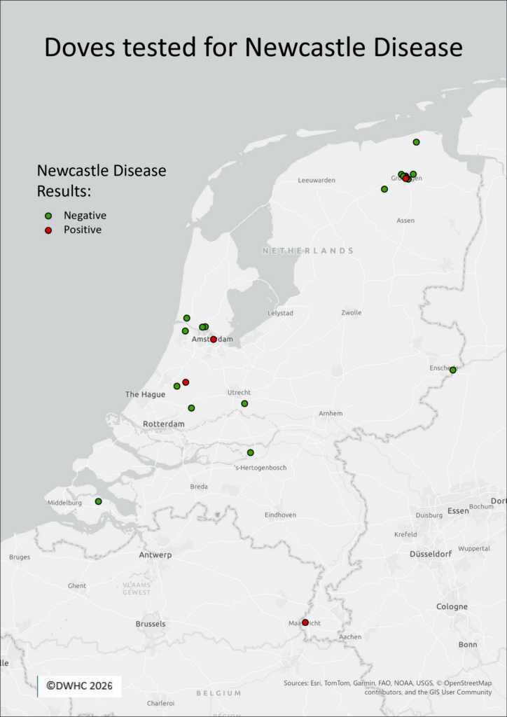 In August 2025, many sick and dead doves were reported to the DWHC from Groningen. During our examination, we found Newcastle Disease (NCD) in two of the doves. Subsequently, we received similar reports from other parts of the Netherlands: birds were hunched over, lying on their sides or backs, sometimes with their heads tilted far back or turning in circles.