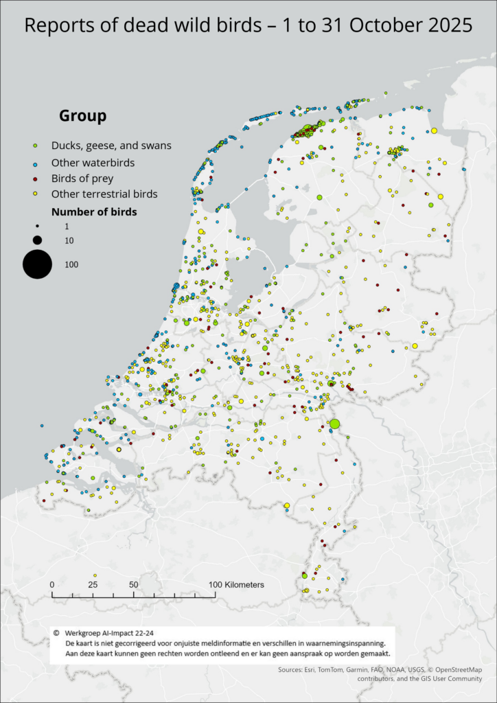 The DWHC, together with Sovon, Waarneming.nl, and the Bird Flu App, monitors where dead wild birds have been found in the Netherlands. The focus is mainly on bird species at risk for avian influenza, but other bird species are also included. The map below provides a national overview of bird mortality in October.