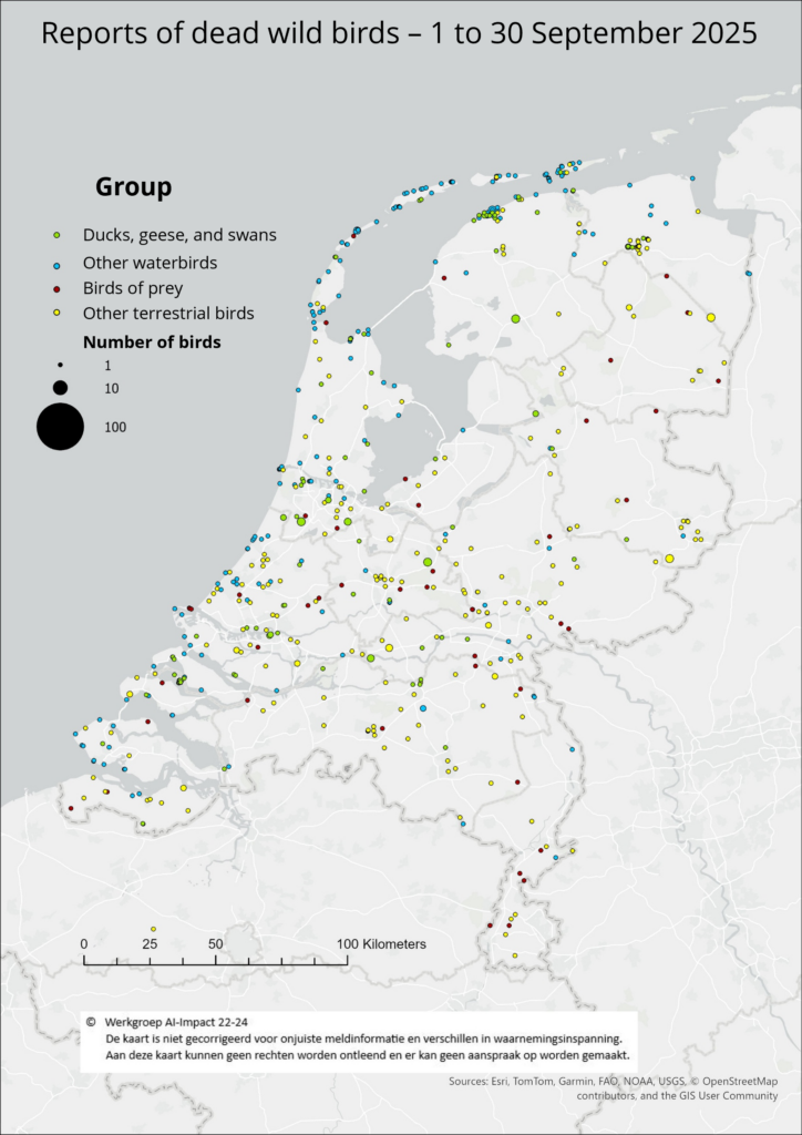 The DWHC, together with Sovon, Waarneming.nl, and the Bird Flu App, monitors where dead wild birds have been found in the Netherlands. The focus is mainly on bird species at risk for avian influenza, but other bird species are also included. The map below provides a national overview of bird mortality in September.