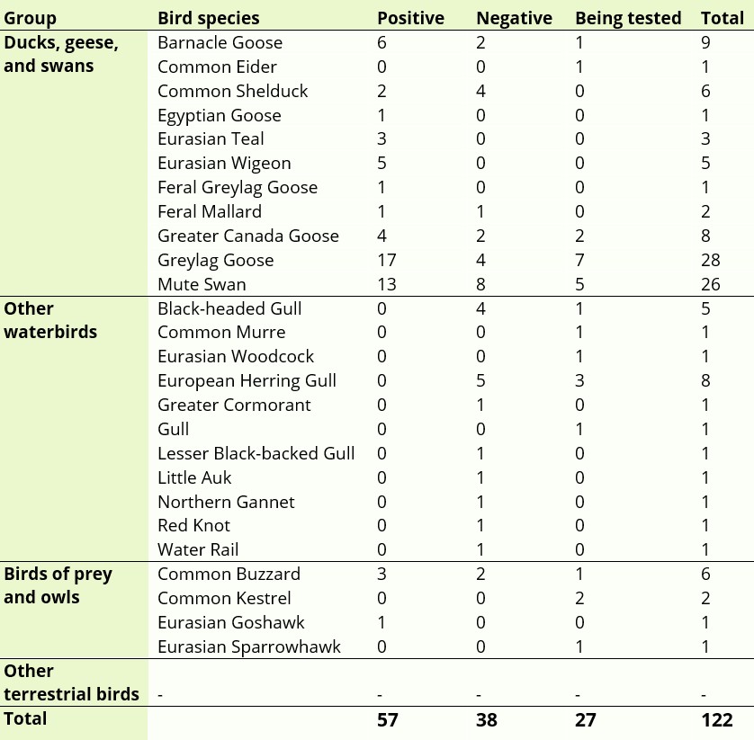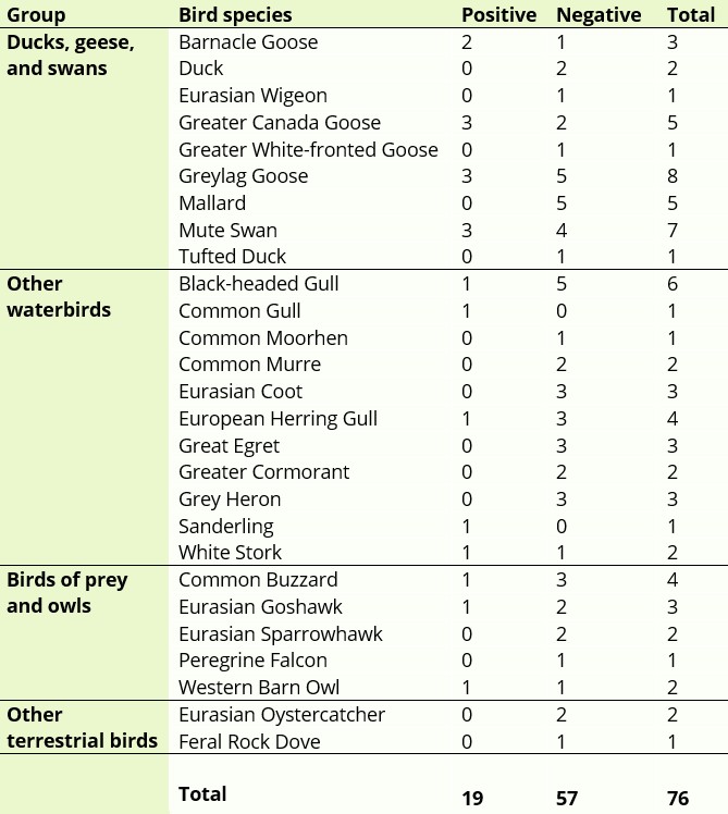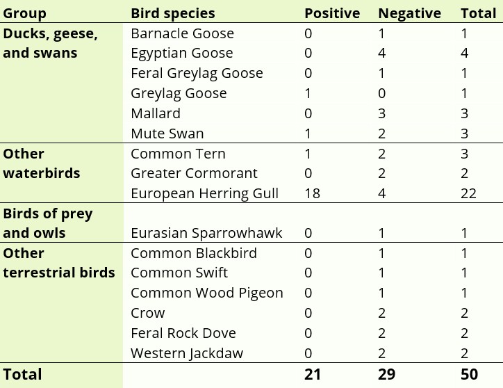 In the month of January, many wild birds were found dead, of which 122 were sent by the DWHC to the WBVR to be tested for avian influenza. These were mainly Barnacle Geese, but throughout the month, more and more gulls and birds of prey were also reported. Other, less common bird species that tested positive for avian influenza this month included the Eurasian Curlew, Grey Heron, and the Common Kestrel.