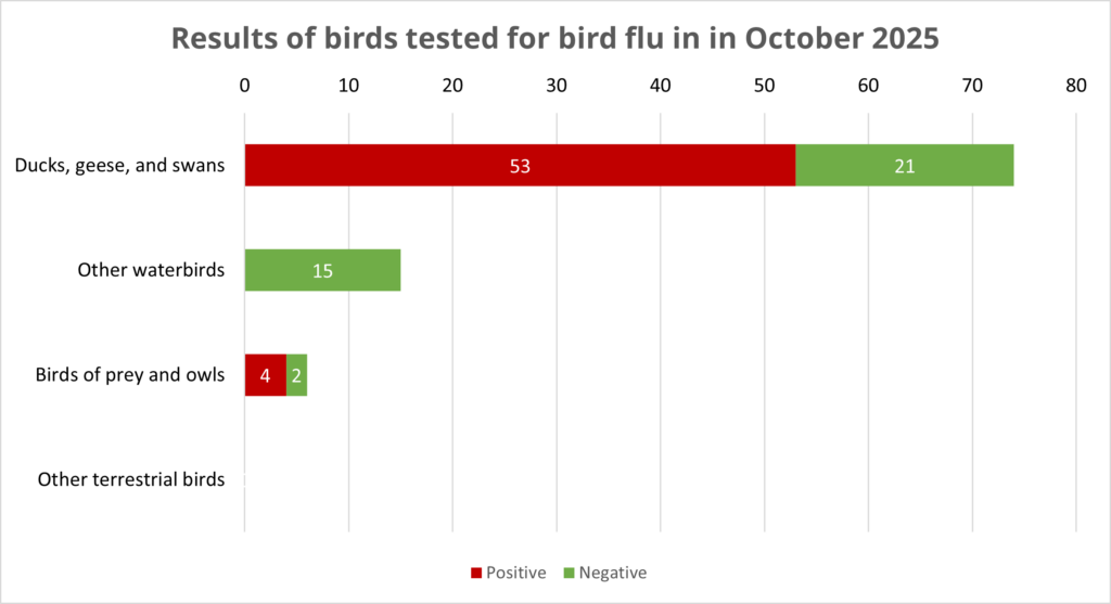 In the month of October the DWHC has sent 122 dead wild birds to the WBVR to test on bird flu this month. Birds are still being tested. So far, 57 positive test results have been found among dead wild birds: 53 in the category of ducks, geese, and swans; and 4 birds of prey. These birds came from the provinces of Groningen, Friesland, Flevoland, Overijssel, Gelderland, North-Holland, South-Holland, North-Brabant, Utrecht, and Zeeland. This page will be updated as soon as we receive new test results.