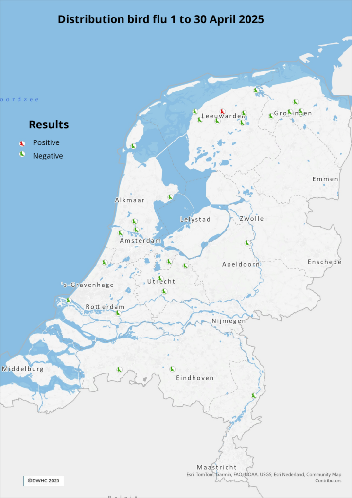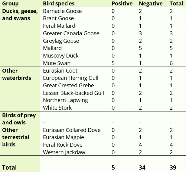 In the month of April, a total of 39 birds were sent to the WBVR by the DWHC for avian influenza testing. The number of reported birds suspected of avian influenza decreased compared to the previous month. This month, the avian influenza virus has been found in five birds. All five birds were mute swans collected on the same day on the same location in the municipality of Leeuwarden, province Friesland. Other birds from the province of Friesland tested negative for bird flu.