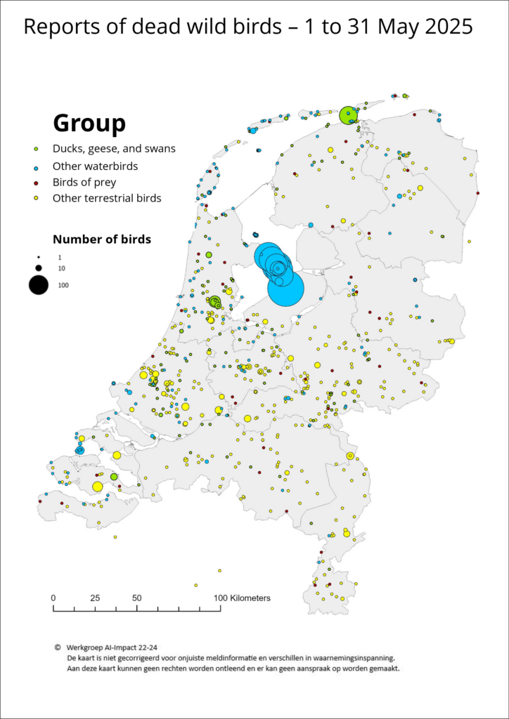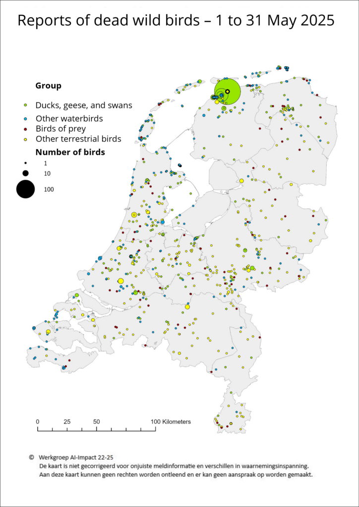 The DWHC, together with Sovon, Waarneming.nl, and the Bird Flu App, monitors where dead wild birds have been found in the Netherlands. The focus is mainly on bird species at risk for avian influenza, but other bird species are also included. The map below provides a national overview of bird mortality in May.