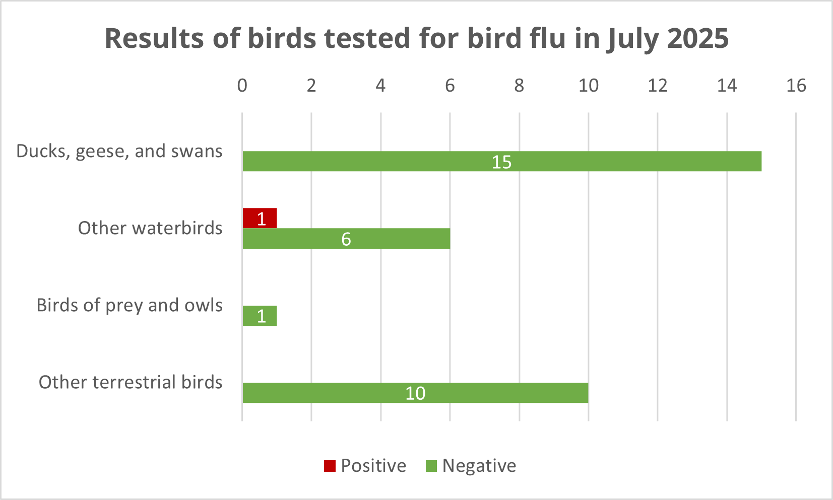 In the month of July, 33 birds were sent to the WBVR by the DWHC to be tested for bird flu. The avian influenza virus was confirmed in one bird that month. The bird that tested positive was a European Herring Gull from the province of Zeeland.