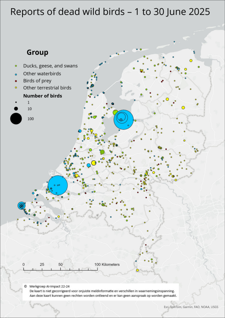 The DWHC, together with Sovon, Waarneming.nl, and the Bird Flu App, monitors where dead wild birds have been found in the Netherlands. The focus is mainly on bird species at risk for avian influenza, but other bird species are also included. The map below provides a national overview of bird mortality in June.