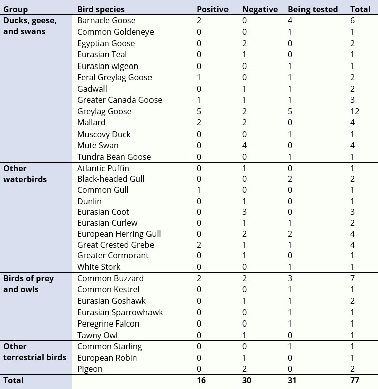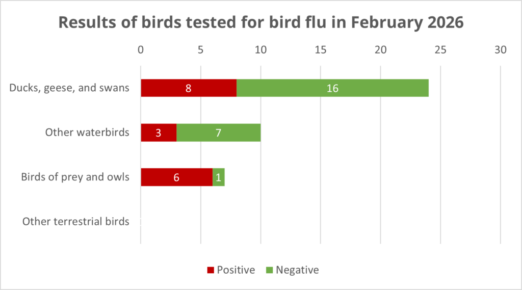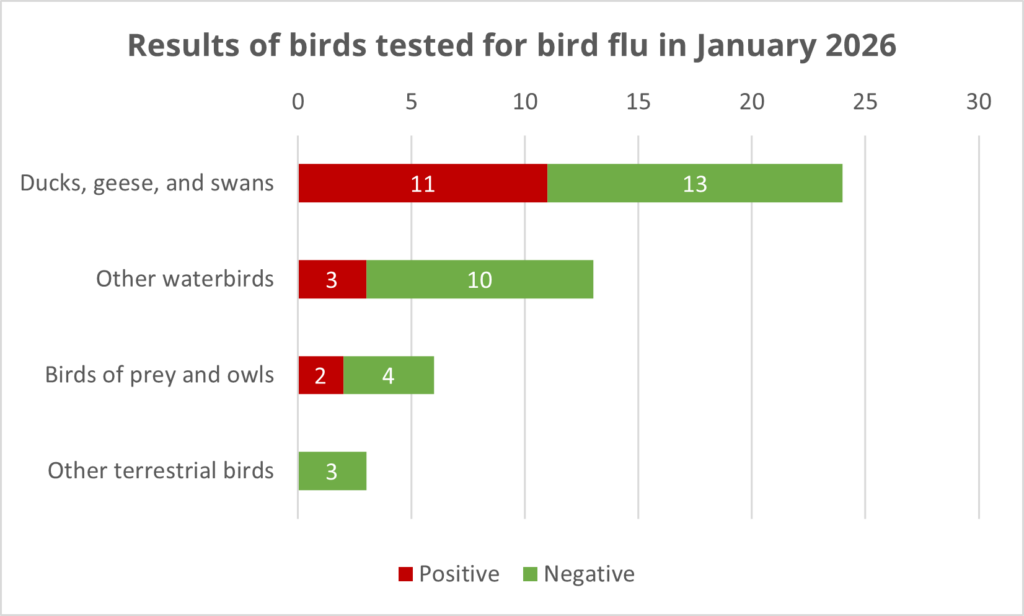 The outbreak of avian influenza among wild birds that began in November 2024 has continued in 2025. In 2026 we keep closely following this outbreak. The DWHC is working together with Wageningen Bioveterinary Research (WBVR) in the research on avian influenza. The DWHC regularly receives reports of dead wild birds. Some of these birds were suitable for research and were collected and tested for infection with avian influenza at the WBVR. On this page you can follow the latest updates on avian influenza test results in 2026 per month. Click here for the monthly overview of bird flu tests in 2025.