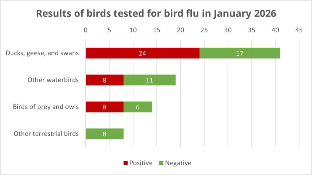 In January, the DWHC sent 82 dead wild birds to the WBVR for avian influenza testing. Of these birds, 40 tested positive: 24 ducks, geese, and swans; 8 other waterbirds; and 8 birds of prey.