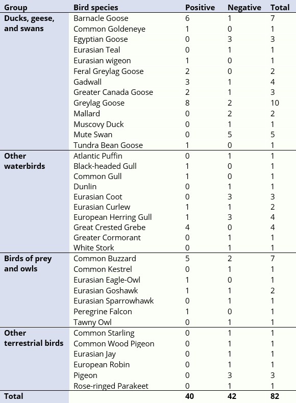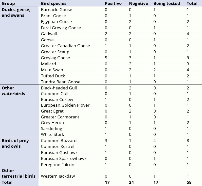 From 1 to 24 February, the DWHC sent 58 dead wild birds to the WBVR for avian influenza testing. Some birds are still being examined and more birds will be collected. Up until now, 17 tests came back positive: 8 ducks, geese, and swans; 3 other waterbirds; and 6 birds of prey This page will be updated as soon as new test results are in.