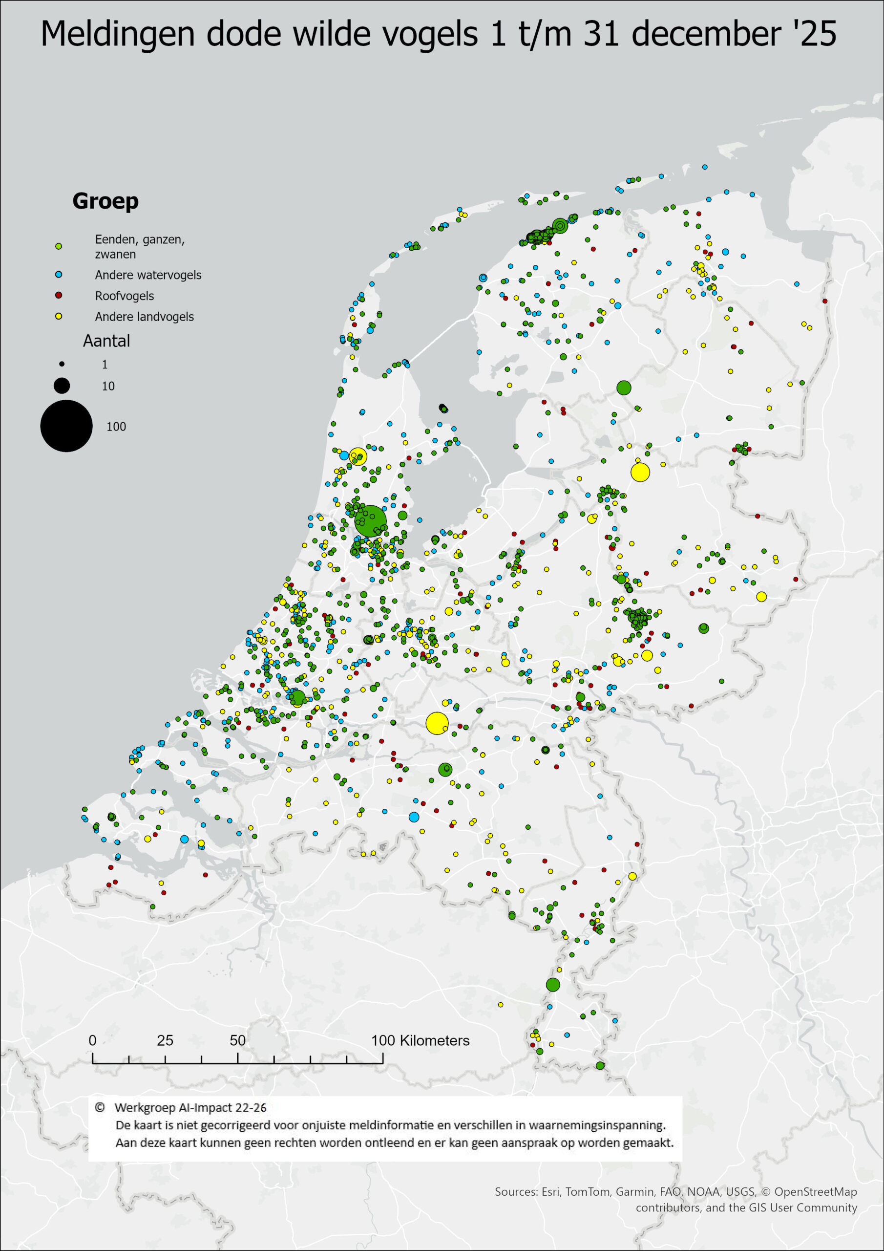 Het Dutch Wildlife Health Centre, samen met Sovon, Waarneming.nl, en de vogelgriep app monitoren waar in Nederland dode wilde vogels zijn gevonden. Het gaat vooral om vogelsoorten die risico lopen op vogelgriep, maar ook andere vogelsoorten zijn hierin meegenomen. Onderstaande kaart geeft een landelijk beeld van de vogelsterfte in december.
