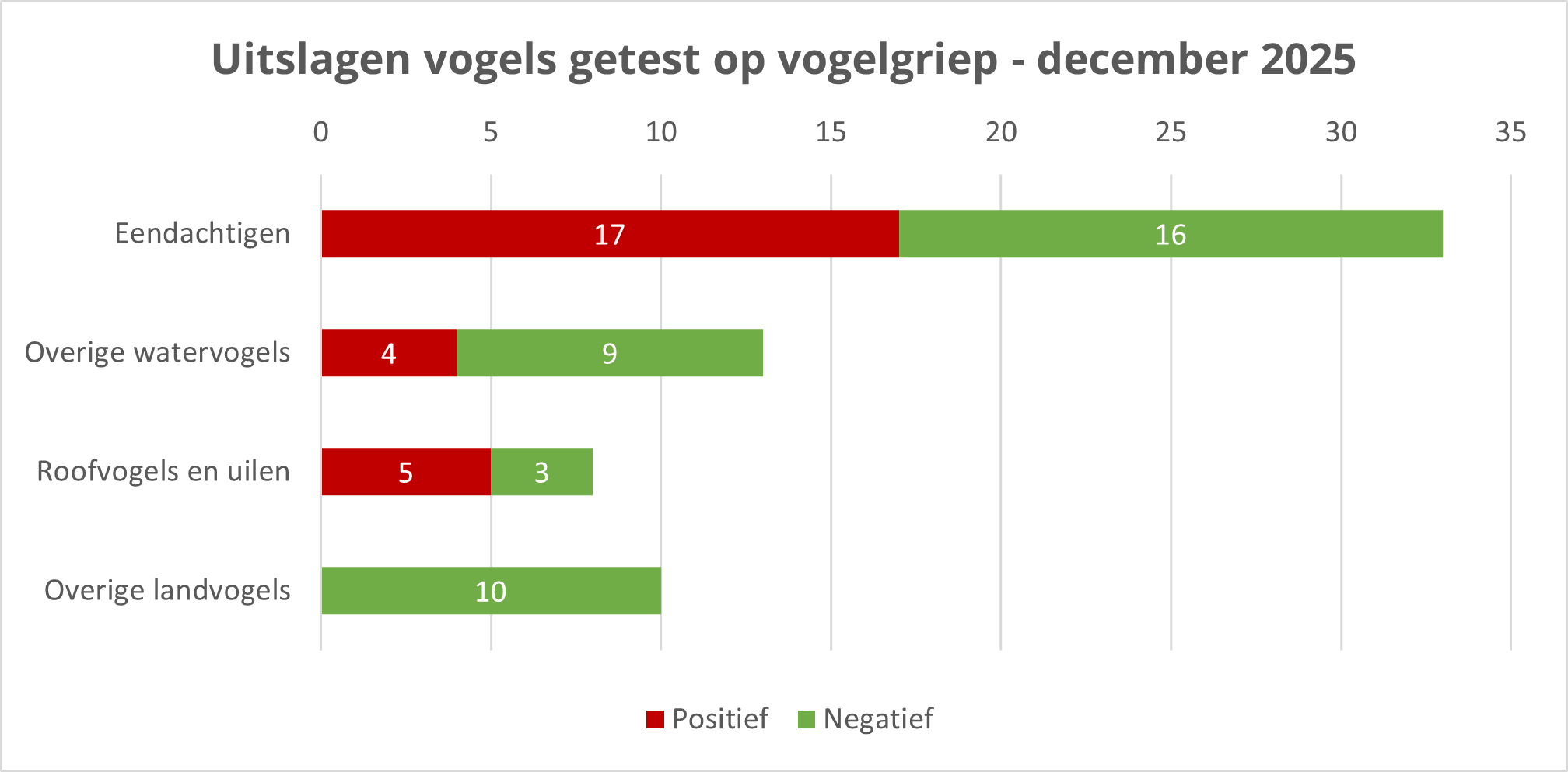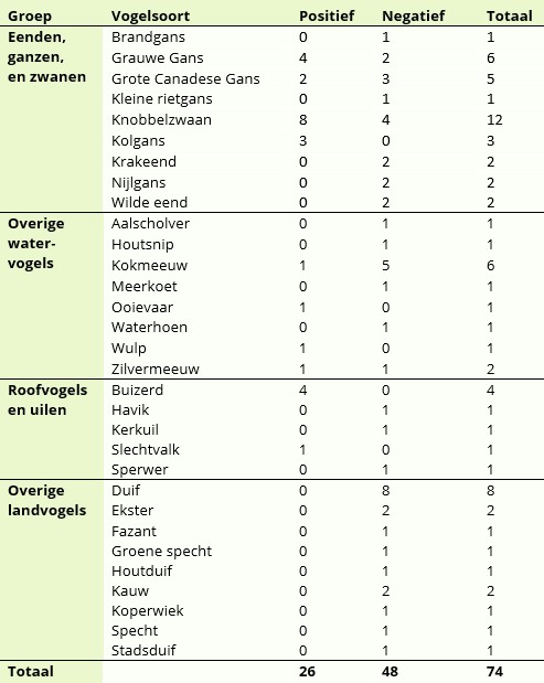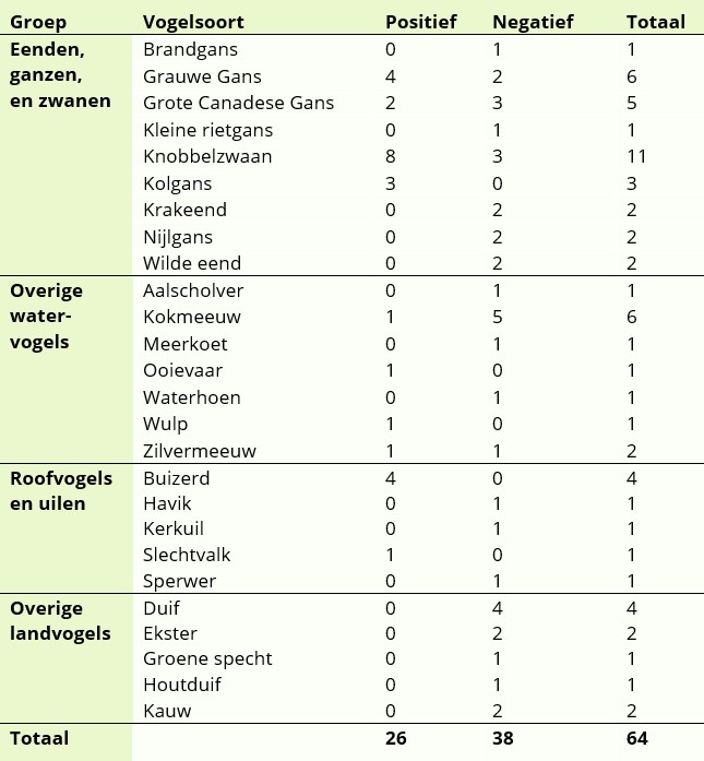 Deze maand zijn er 125 dode wilde vogels door het DWHC naar het WBVR gestuurd om te testen op vogelgriep. Er zijn 73 positieve testresultaten onder dode wilde vogels gevonden: 62 eendachtigen, 5 overige watervogels, en 6 roofvogels. Deze vogels kwamen uit de provincies Groningen, Friesland, Flevoland, Overijssel, Gelderland, Noord-Holland, Zuid-Holland, Noord-Brabant, Utrecht, en Zeeland.