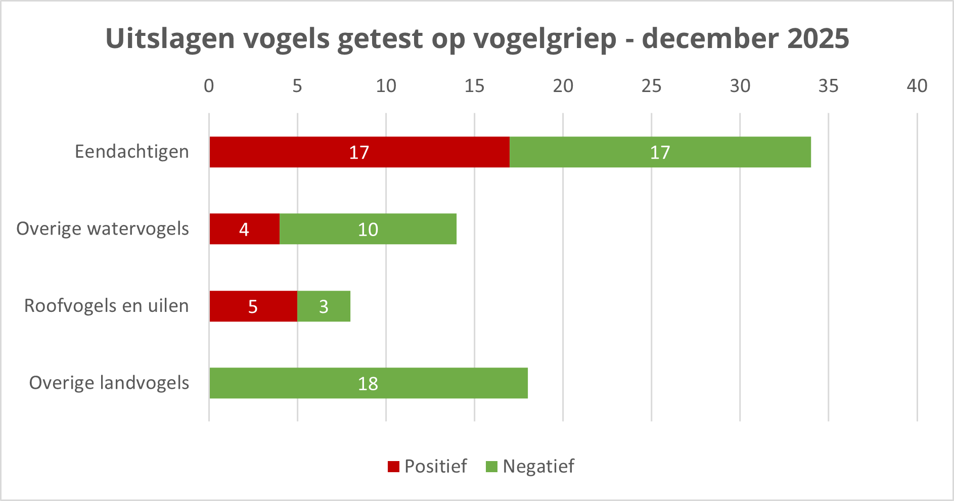 In december zijn er 74 dode wilde vogels door het DWHC naar het WBVR gestuurd om te testen op vogelgriep. Er 26 positieve testresultaten onder dode wilde vogels gevonden: 17 eendachtigen, 4 overige watervogels, en 5 roofvogels. Deze vogels kwamen uit de provincies Flevoland, Friesland, Gelderland, Groningen, Limburg, Noord-Brabant, Noord-Holland, Overijssel, Utrecht, Zeeland, en Zuid-Holland.