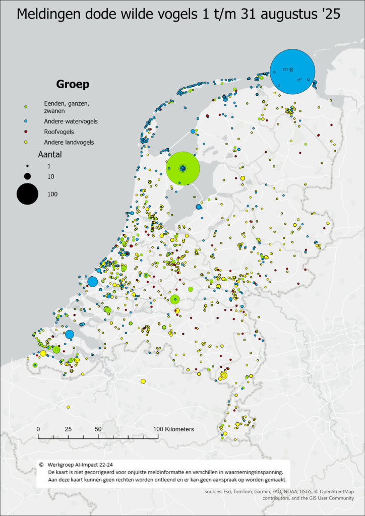 Het Dutch Wildlife Health Centre, samen met Sovon, Waarneming.nl, en de vogelgriep app monitoren waar in Nederland dode wilde vogels zijn gevonden. Het gaat vooral om vogelsoorten die risico lopen op vogelgriep, maar ook andere vogelsoorten zijn hierin meegenomen. Onderstaande kaart geeft een landelijk beeld van de vogelsterfte in augustus.