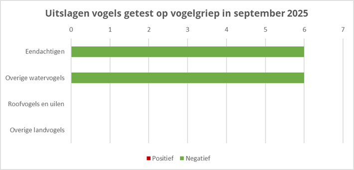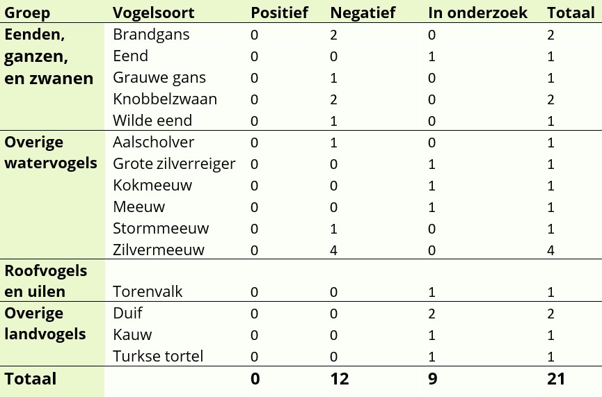 In de maand september zijn er 21 vogels door het DWHC naar het WBVR gestuurd om te testen op vogelgriep. Het vogelgriepvirus is in deze maand nog niet vastgesteld. Er zijn nog 9 vogels in onderzoek. Zodra de uitslagen bekend zijn, wordt deze pagina vernieuwd.