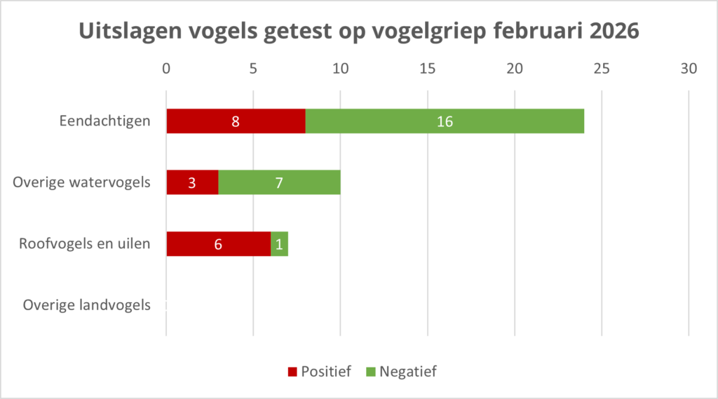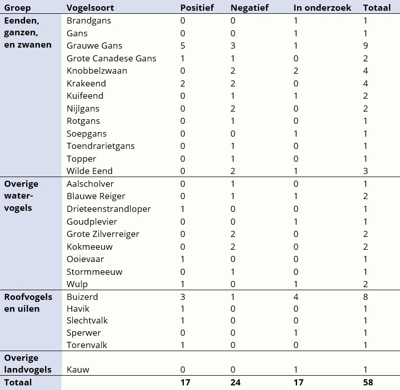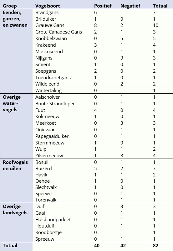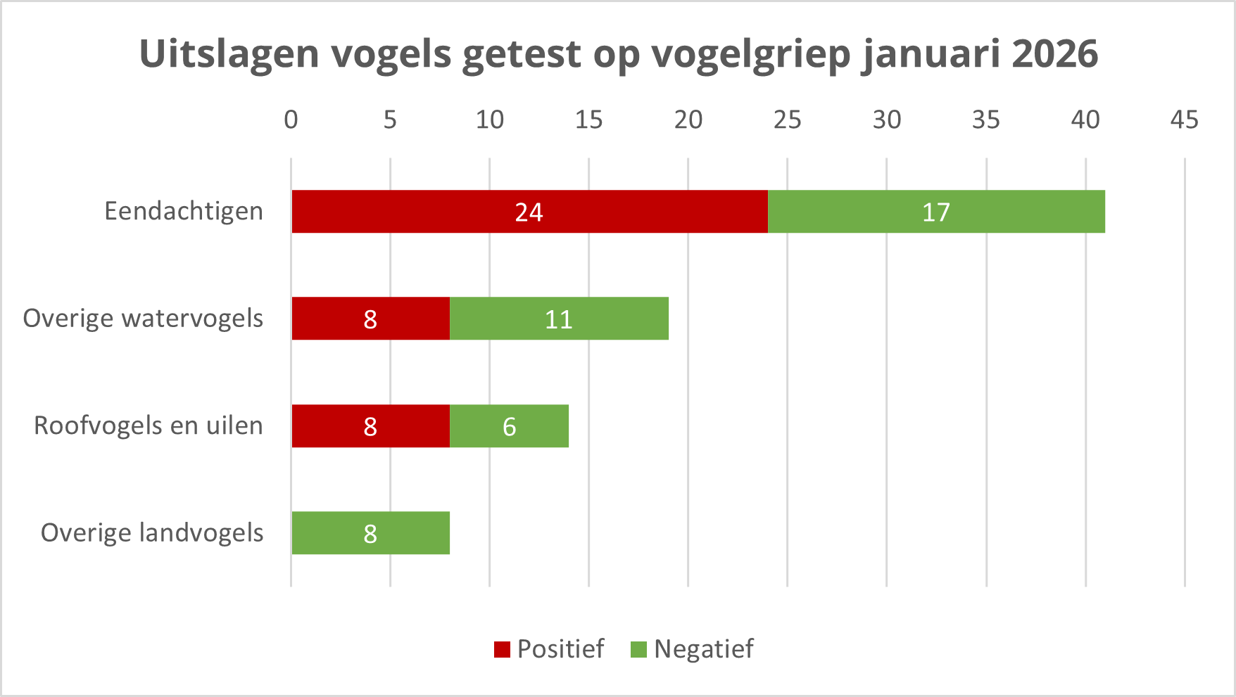 In januari zijn er 82 dode wilde vogels door het DWHC naar het WBVR gestuurd om te testen op vogelgriep. Hiervan zijn 40 uitslagen positief: 24 eendachtigen, 8 overige watervogels, en 8 roofvogels.