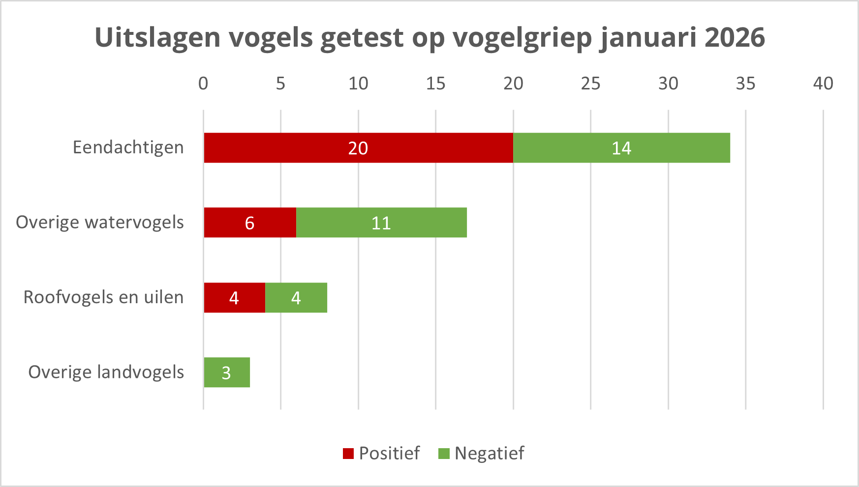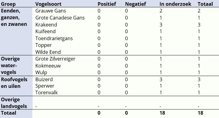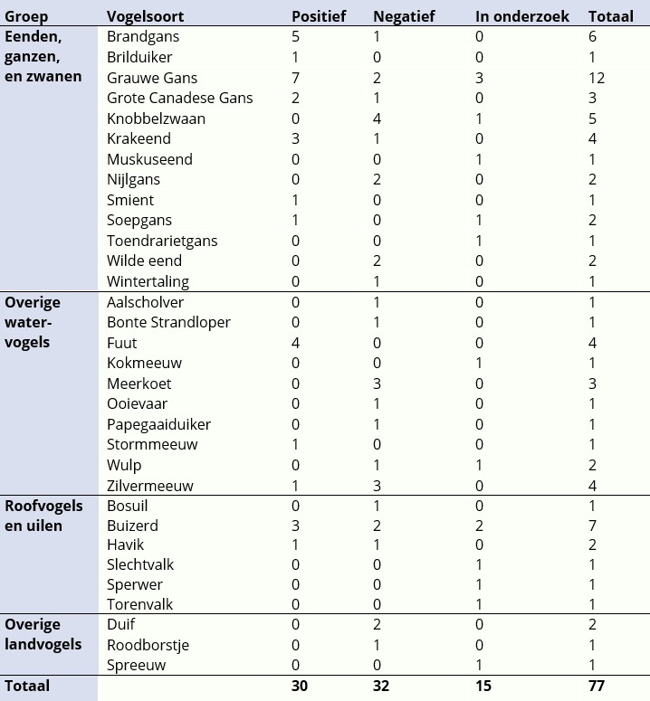 In januari zijn er 77 dode wilde vogels door het DWHC naar het WBVR gestuurd om te testen op vogelgriep. Er zijn nog vogels in onderzoek. Tot nu toe zijn er 30 positieve uitslagen binnen: 20 eendachtigen, 6 overige watervogels, en 4 roofvogels. Zodra nieuwe testresultaten bij ons binnenkomen, wordt deze pagina vernieuwd.