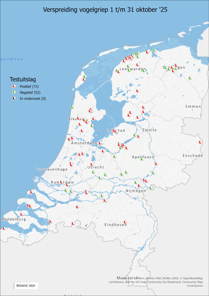 Het Dutch Wildlife Health Centre, samen met Sovon, Waarneming.nl, en de vogelgriep app monitoren waar in Nederland dode wilde vogels zijn gevonden. Het gaat vooral om vogelsoorten die risico lopen op vogelgriep, maar ook andere vogelsoorten zijn hierin meegenomen. Onderstaande kaart geeft een landelijk beeld van de vogelsterfte in oktober.