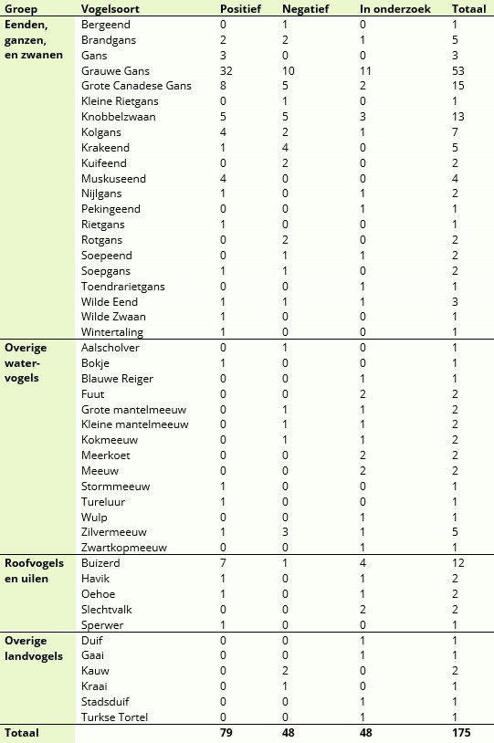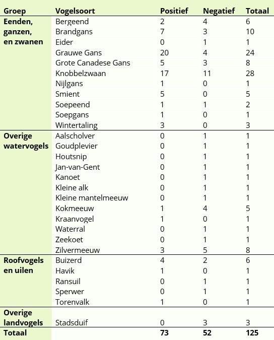 Deze maand zijn er 125 dode wilde vogels door het DWHC naar het WBVR gestuurd om te testen op vogelgriep. Er zijn 73 positieve testresultaten onder dode wilde vogels gevonden: 62 eendachtigen, 5 overige watervogels, en 6 roofvogels. Deze vogels kwamen uit de provincies Groningen, Friesland, Flevoland, Overijssel, Gelderland, Noord-Holland, Zuid-Holland, Noord-Brabant, Utrecht, en Zeeland.