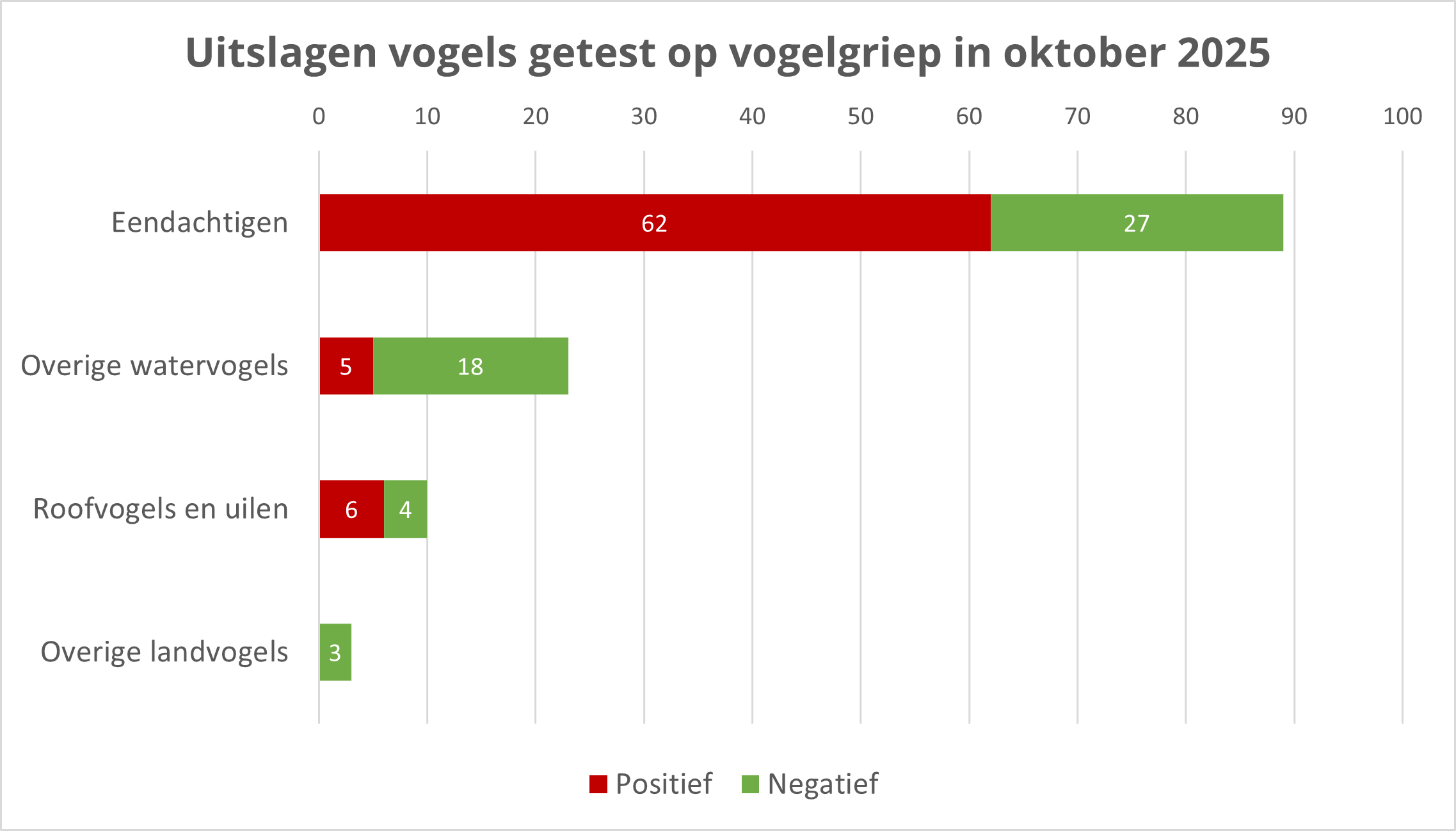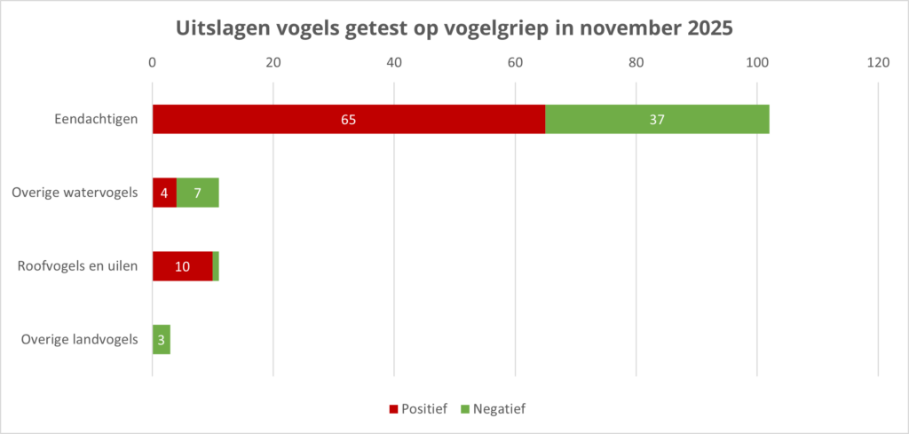 In november zijn er 175 dode wilde vogels door het DWHC naar het WBVR gestuurd om te testen op vogelgriep. Er zijn nog dieren in onderzoek. Tot nu toe zijn er 79 positieve testresultaten onder dode wilde vogels gevonden: 65 eendachtigen, 4 overige watervogels, en 10 roofvogels en uilen. Deze vogels kwamen uit de provincies Drenthe, Flevoland, Friesland, Gelderland, Limburg, Noord-Brabant, Noord-Holland, Overijssel, Utrecht, Zeeland, en Zuid-Holland. Zodra nieuwe testresultaten bij ons binnenkomen, wordt deze pagina vernieuwd.